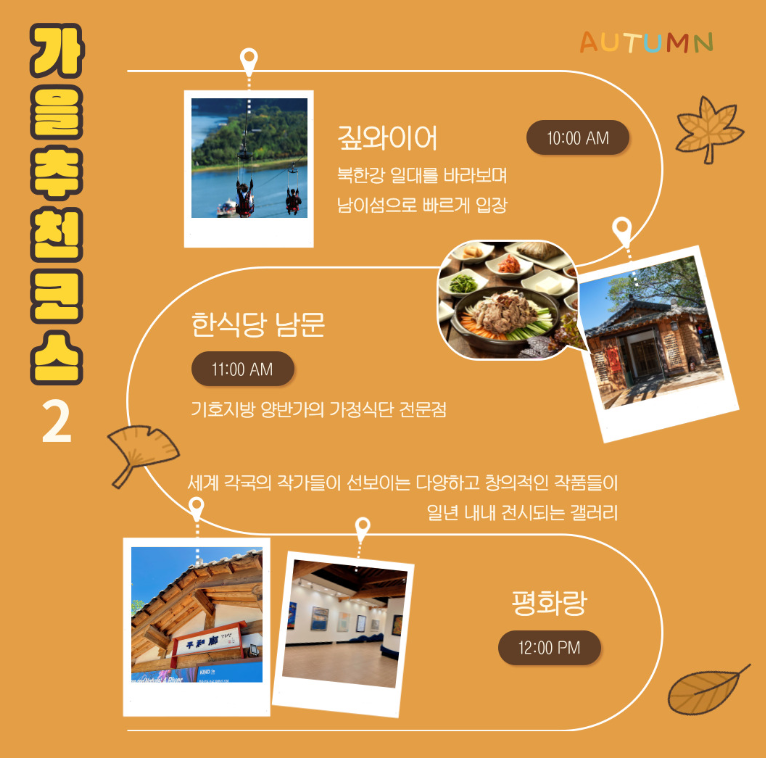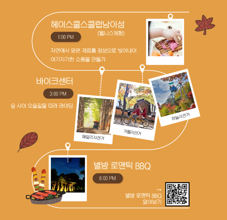 주말에는 많은 방문객이 몰리기 때문에 평일 방문을 추천합니다. 아이와 함께라면 그림책 놀이터와 전시 프로그램도 놓치지 말고 즐겨보세요. 남이섬의 단풍 절정기를 놓치지 않고 방문해 특별한 가을 추억을 남겨보세요.